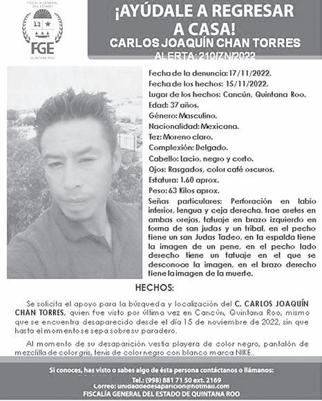 fichas publicadas ayer fueron una Alerta AMBER de una menor de 13 años, identificada como Cindy Nayeli Gutiérrez Vázquez, extraviada en la comunidad de Nicolás Bravo y otra de un hombre llamado Carlos Joaquín Chan Torres, quien fue visto por última vez el pasado 15 de noviembre, en Benito Juárez