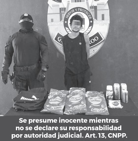 La Policía Municipal informó la detención de L. J. H. C., de 26 años, originario de Mérida, Yucatán, por tener en su posesión tres bolsitas de supuesta cocaína y cuatro de marihuana.