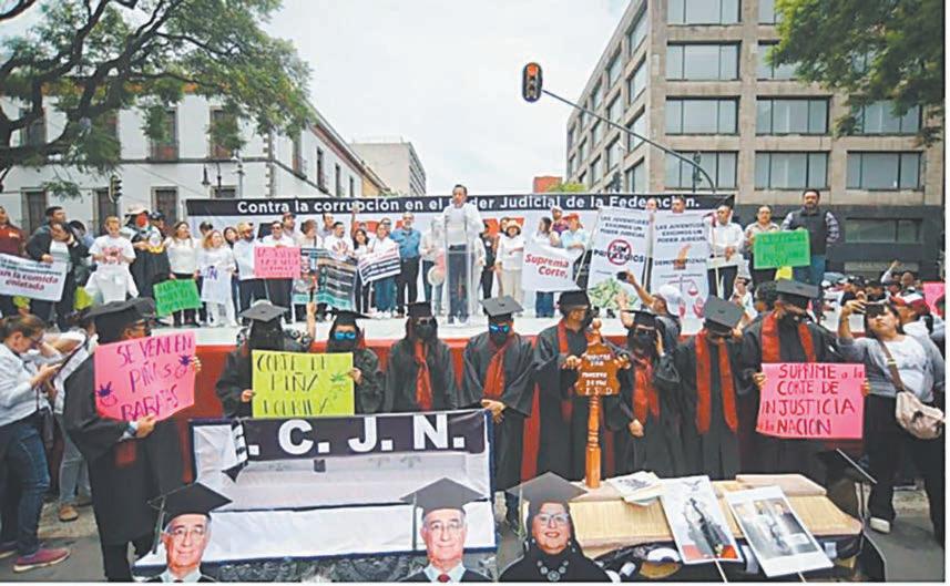 Simpatizantes de Morena colocaron féretros con la imagen de la presidenta de la Suprema Corte, Norma Lucía Piña Hernández, y del ministro Alberto Pérez Dayán, durante un mitin “contra la corrupción” en el Poder Judicial Federal encabezado este sábado por el gobernador de Veracruz, Cuitláhuac García Jiménez, frente a la sede de la SCJN en el centro Vestidos con toga y birrete, los morenistas veracruzanos ingresaron al Centro Histórico con los ataúdes a los que les colocaron foto de los ministros mencionados y las siglas de la Suprema Corte de Justicia de la Nación. ncluso llevaron una cruz de madera que textualmente decía: “Ministra Piña. Ministro Dayán. E.P.D”, así como pancartas con las siguientes leyendas: “Se venden piñas baratas”, “Corte