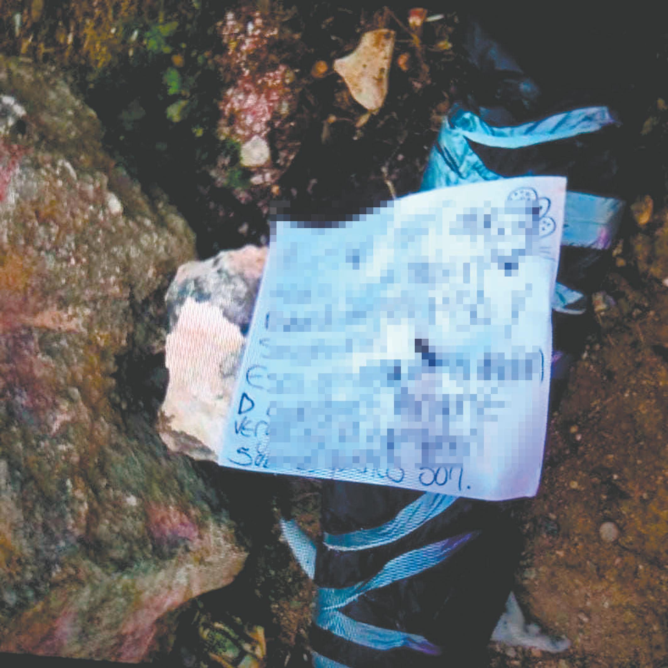 una persona, el cual se encontraba envuelto en bolsas negras y atado con cinta industrial. Además, junto a él se encontraba un mensaje escrito con una cartulina.