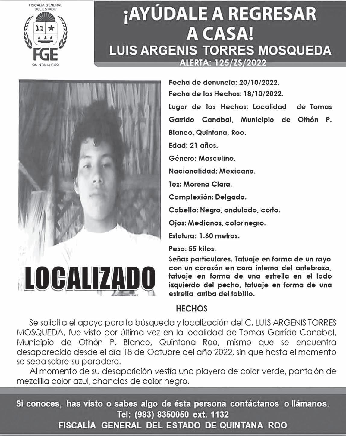 Por Abraham CohuóCHETUMAL.- Esta madrugada se desactivó la ficha de búsqueda de Luis Argenis Torres Mosqueda, joven que había sido reportado como desaparecido desde el pasado 18 de octubre en la comunidad de Tomás Garrido, en la zona limítrofe entre Quintana Roo y Campeche.