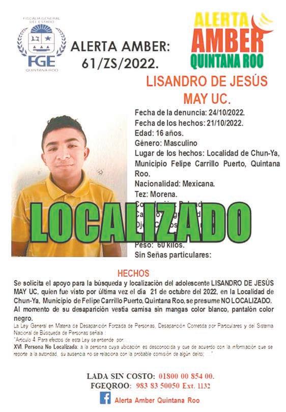 La Fiscalía General del Estado reportó que la desactivación de la fi cha de búsqueda de Torres Mosqueda se realizó debido a que fue localizado sin vida, aunque no precisó en qué zona del municipio Othón P. Blanco ocurrió su hallazgo.