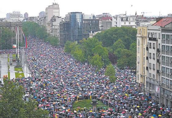 Frente a la sede de la televisora RTS sonaron silbatos y abucheos. La gente dice que, según la ley, la TV estatal debe ser imparcial, pero que ha sido abiertamente favorable al Gobierno. Las protestas constituyen el inicio de la mayor rebelión contra el régimen de Vucic en sus 10 años en el poder.