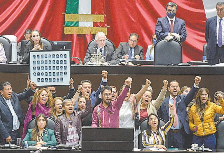 CIUDAD DE MÉXICO.- Con el ya acostumbrado conteo del 1 al 43 y los puños en alto, el pleno de la Cá mara de Diputados rindió homenaje ayer a los normalistas de la Escuela Normal Rural “Rául Isidro Burgos”, de Ayotzinapa, desaparecidos hace ocho años en Iguala, Guerrero.