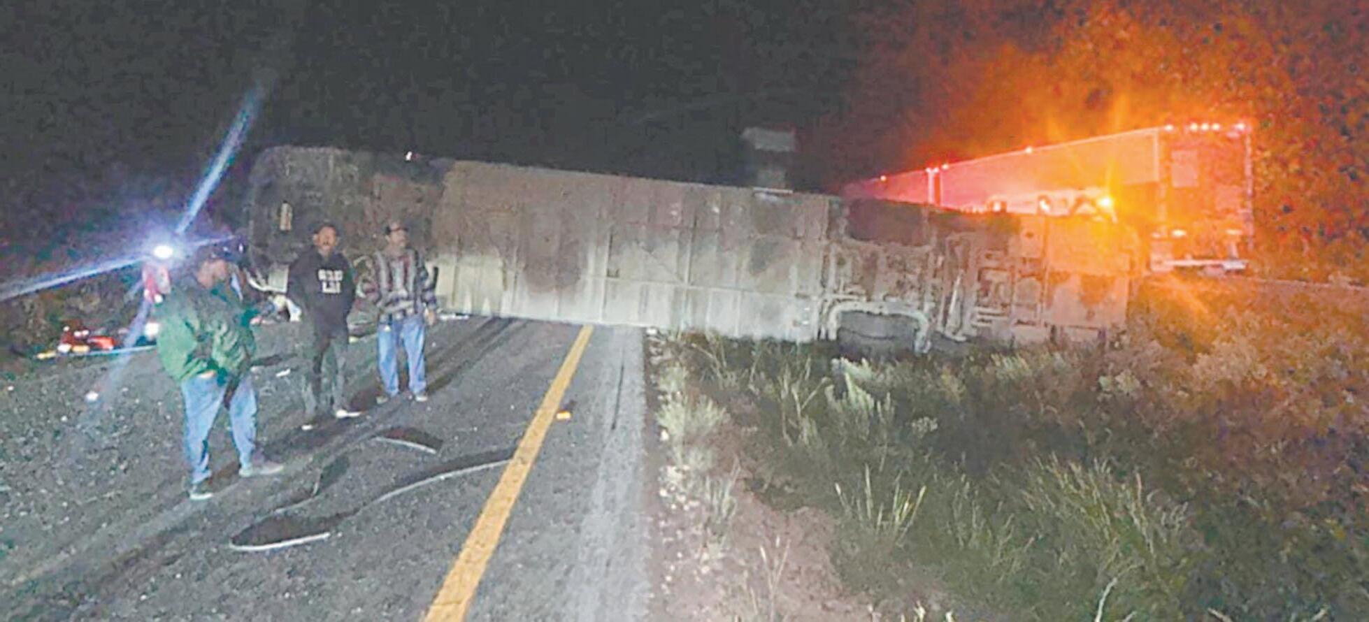 VILLA DE COS, Zacatecas.Ayer por la madrugada, un autobús de pasajeros de la línea Ómnibus de México sufrió un accidente tipo volcadura en la Carretera Federal 54 Zacatecas-Saltillo, específicamente en el kilómetro 092+200, cerca de la comunidad de Sierra Vieja, en el municipio de Villa de Cos. Como resultado del incidente vial, dos personas perdieron la vida y 20 resultaron heridas.