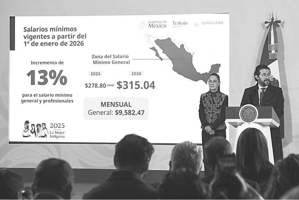 La presidenta Claudia Sheinbaum Pardo anunció ayer que, tras acuerdo con el sector obrero y patronal, el salario mínimo general tendrá un incremento del 13% a partir del 1 de enero de 2026, de 315.04 pesos diarios a nivel general, es decir, 9 mil 582.47 pesos mensuales, y de 5% en la Zona Libre de la Frontera Norte (ZLFN) para quedar en 440.87 pesos diarios y en 13 mil 409.80 pesos mensuales.