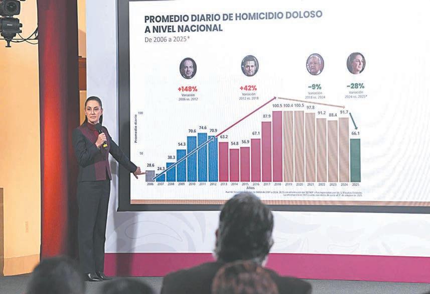 que, de 2006, último año del sexenio del presidenta Vicente Fox, al 2012, último de Felipe Calderón, los homicidios dolosos aumentaron en 148%, como resultado de la llamada Guerra contra el narco y, de igual forma, del último año de Calderón al último de Enrique Peña Nieto, incrementaron en 42%. Añadió que, del último año de Peña al último del expresidente Andrés Manuel López Obrador en 2024, la reducción en este delito fue de 9%. Y al 31 de octubre de 2025, la disminución es del 28%. Por ello, La titular del Secretariado Ejecutivo del Sistema Nacional