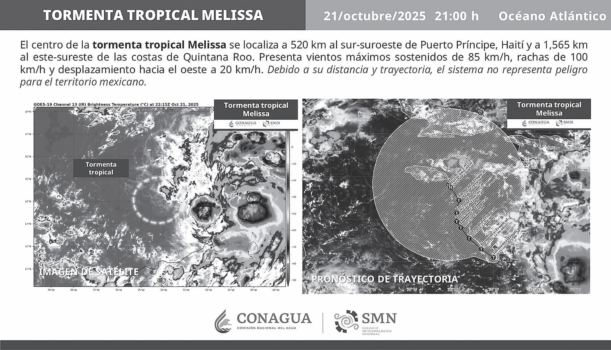 Melissa se encontraba al cierre de esta sección a unos 490 km al Sur de Puerto Príncipe, Haití, con vientos máximos sostenidos de 80 km/h, y se movía con dirección Oeste a 24 km/h.