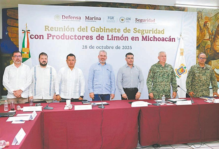 El Gobierno federal anunció ayer la implementación de acciones estratégicas con el propósito de fortalecer la seguridad para garantizar las actividades productivas de los trabajadores del campo de la región, luego del reciente asesinato de Bernardo Bravo Manríquez, líder limonero de Michoacán. Omar García Harfuch, secretario de Seguridad y Protección Ciudadana (SSPC), y Ricardo Trevilla Tejo, titular de la Secretaría de la Defensa Nacional (Defensa), se reunieron en el municipio de Apatzingán con productores de limón y autoridades locales para fortalecer la estrategia contra la extorsión. Durante el encuentro, el titular de la SSPC, Omar García Harfuch, señaló que por instrucción de la presidenta, Claudia Sheinbaum Pardo, y con el objetivo de disminuir actos ilícitos en contra del sector citrícola en el estado de Michoacán se acordó aumentar y reforzar las labores de inteligencia en esa entidad.