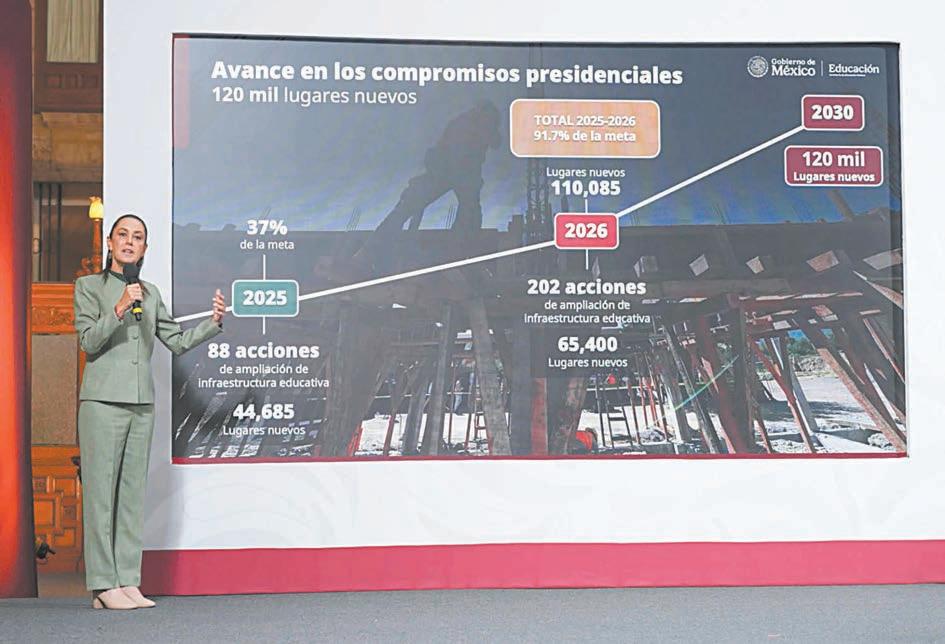 mil lugares se aumenta la cobertura en la Educación Media Superior en 85%. Detalló que en 2025 se han realizado 88 acciones que se entregarán en noviembre y diciembre: construcción de 20 planteles nuevos, 33 ampliaciones y 35 reconversiones de secundarias a preparatorias en los turnos vespertinos, con lo que se tiene un avance del 37% de la meta.