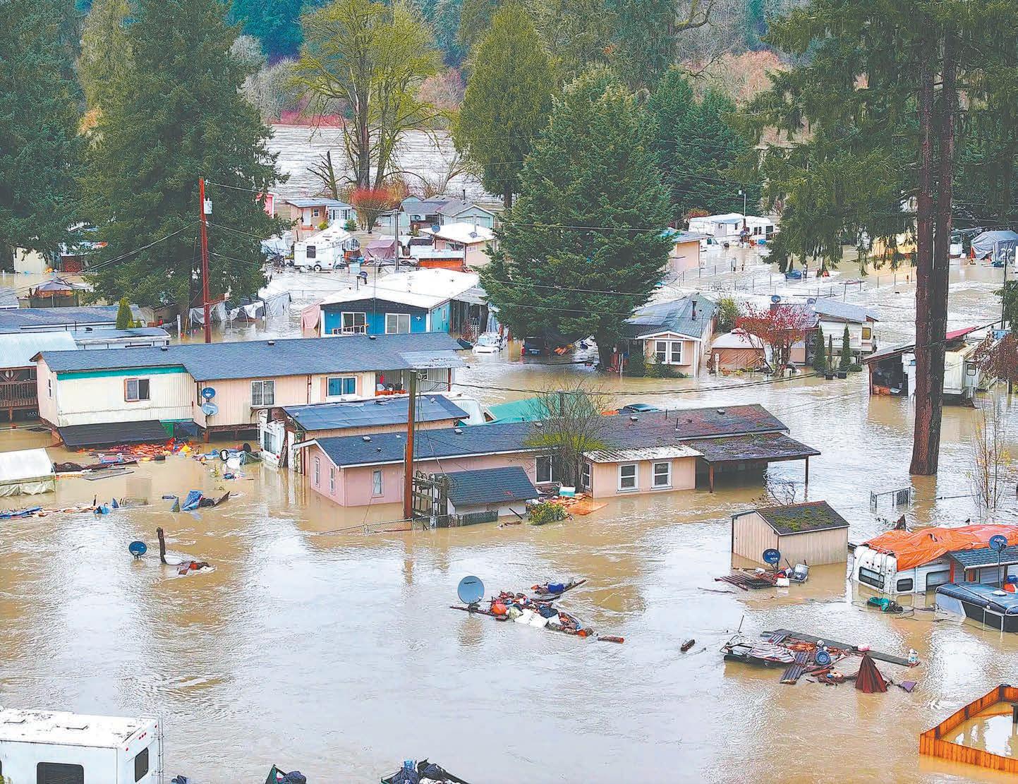 En un valle que conduce a las estribaciones del monte Rainier, al sureste de Seattle, agentes de la Policía del condado Pierce rescataron a personas en una zona de casas rodantes en Orting, donde el agua llega a la cintura.