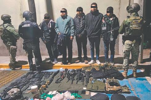 ZACATECAS, Zac.- Cinco hombres, presuntos integrantes de una célula criminal, fueron detenidos con un arsenal, más de mil dosis de drogas, dinero en efectivo y equipo táctico tras un cateo realizado por elementos de seguridad en el municipio de Jalpa en Zacatecas. La captura se llevó a cabo derivado de actividades de Inteligencia y operativos nocturnos en el que participaron Fuerzas de Seguridad de los tres órdenes de Gobierno. En la acción fueron detenidos Luis Alberto “N”, de 21 años de edad y originario de Jalisco; Antonio “N”, de 22 años y de Nayarit; Daniel “N”, de 22 años y originario de Chiapas; Jesús Enrique “N”, de 22 años y proveniente del Estado de México; así como José Ángel “N”, de 27 años y originario de Zacatecas. Durante el operativo, las autoridades aseguraron tres automóviles, además de seis armas de fuego (cinco largas y una corta) y seis granadas. El decomiso también consistió en 52 cargadores para armas largas, tres de arma corta y un total de mil 682 cartuchos de diferentes calibres, así como cuatro chalecos balísticos, cinco placas balísticas y 12 dispositivos de comunicación empleados para actividades ilícitas. Respecto a las sustancias prohibidas, se incautaron 192 bolsas con hierba seca con las características de la marihuana, además de frascos y botes con semilla del mismo enervante. También se decomisaron 938 dosis de una sustancia cristalina identificada como cristal y 671 dosis de polvo blanco considerado cocaína. El operativo culminó con el aseguramiento de una suma en efectivo de 636 mil 700 pesos, que estaba en posesión de los detenidos. Posteriormente, tanto los individuos como los objetos decomisados quedaron a disposición de la autoridad competente para el desarrollo de las investigaciones