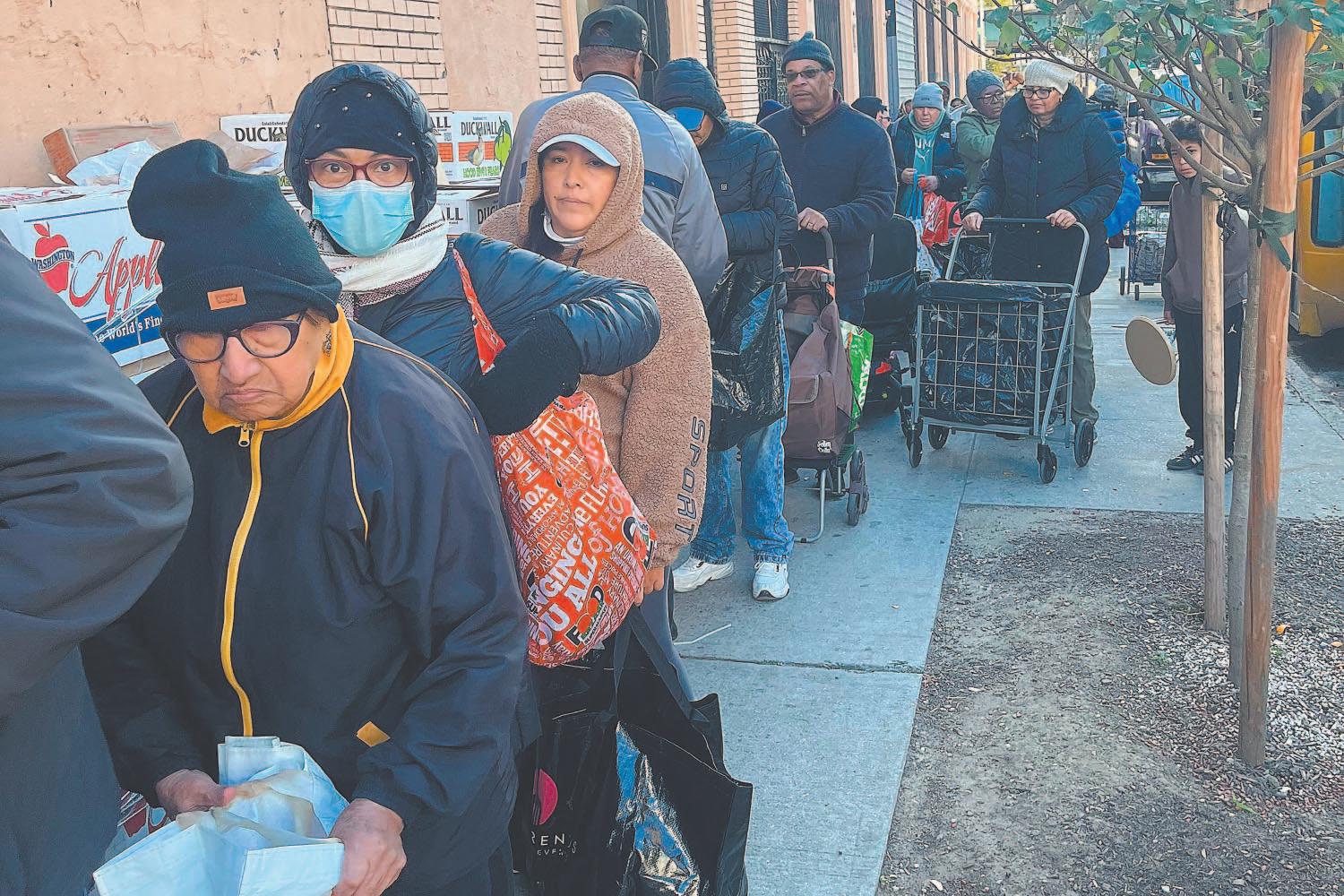 En el distrito del Bronx en Nueva York, alrededor de 200 personas -más de lo habitualacudieron al banco de alimentos World of Life Christian Fellowship International , muchas abrigadas con gorros y abrigos de invierno y empujando carritos de compras plegables mientras esperaban en una fi la que abarcaba varias cuadras de la ciudad. Algunas de ellas llegaron incluso desde las 4:00 para elegir entre plataformas de frutas, verduras, pan, leche, jugo, productos secos y sándwiches preparados.