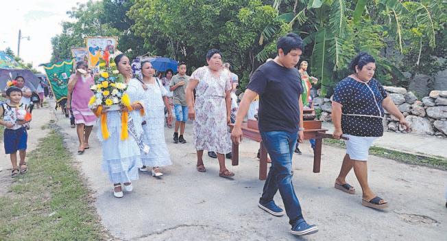 La embajadora Karina Alejandra Ek Keb encabezó la columna de los feligreses. Todo el pueblo participó en el inicio de la festividades en la comisaría. (Enrique Chan)