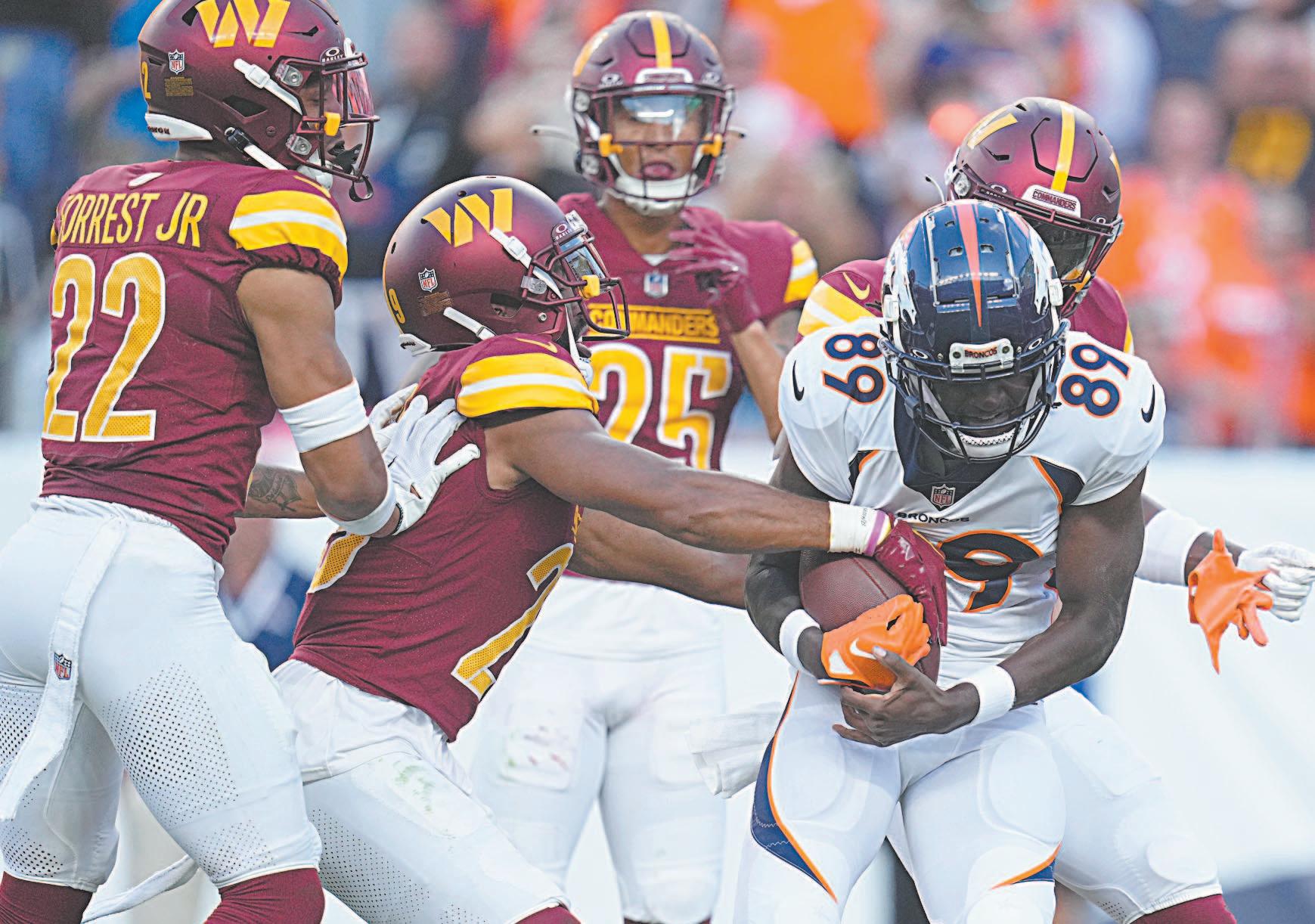 A pesar de lo impresionante que fue la remontada de Washington (la mayor del equipo fuera de casa desde 1990), estuvo peligrosamente cerca de estropearse. Denver anotó nueve puntos en sus dos últimas series, incluido el Hail Mary de 50 yardas que fue lanzado en el aire y atrapado por Brandon Johnson. La subsiguiente conversión de dos puntos, que habría empatado el partido, quedó incompleta, y sin tiempo restante en el reloj, Washington salió con una victoria del Mile High Stadium, donde no había ganado desde 2001. (AP)