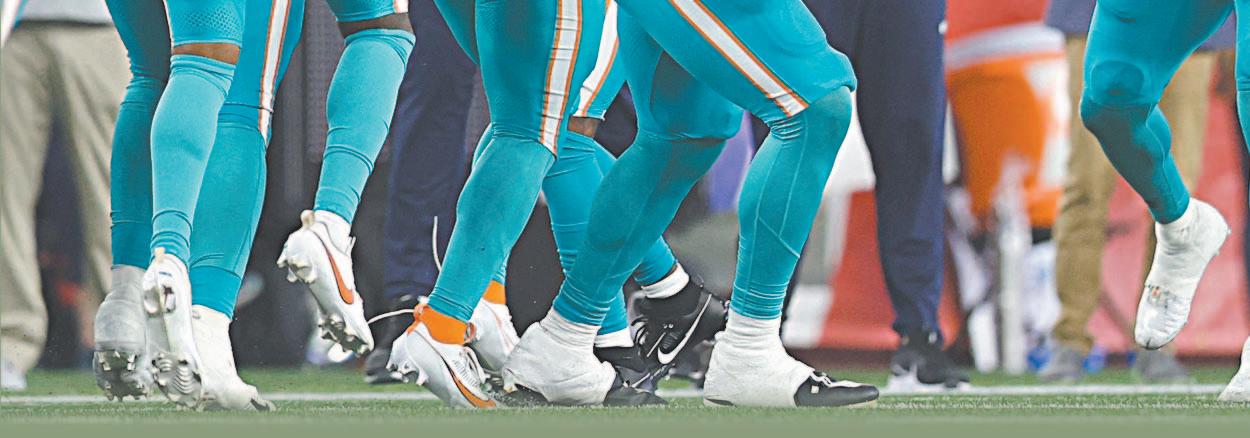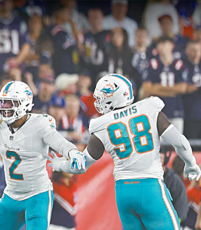 la reciente temporada baja. La primera mitad de Tagovailoa fue aguda, serena y eficiente. No tuvo ningún problema para atravesar la defensa de los Patriotas de Nueva Inglaterra con un juego terrestre saludable que lo complementaba. Solo en la primera mitad, registró 181 yardas aéreas en 15 de 20 pa-