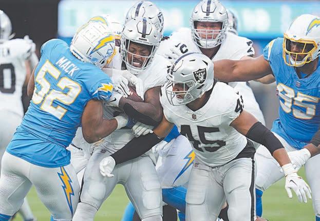 Khalil Mack estableció un récord de la franquicia en un juego con seis capturas de quarterback, Justin Herbert participó en tres touchdowns y los Chargers de Los Ángeles se sostuvieron para vencer a los Raiders de Las Vegas 24-17.