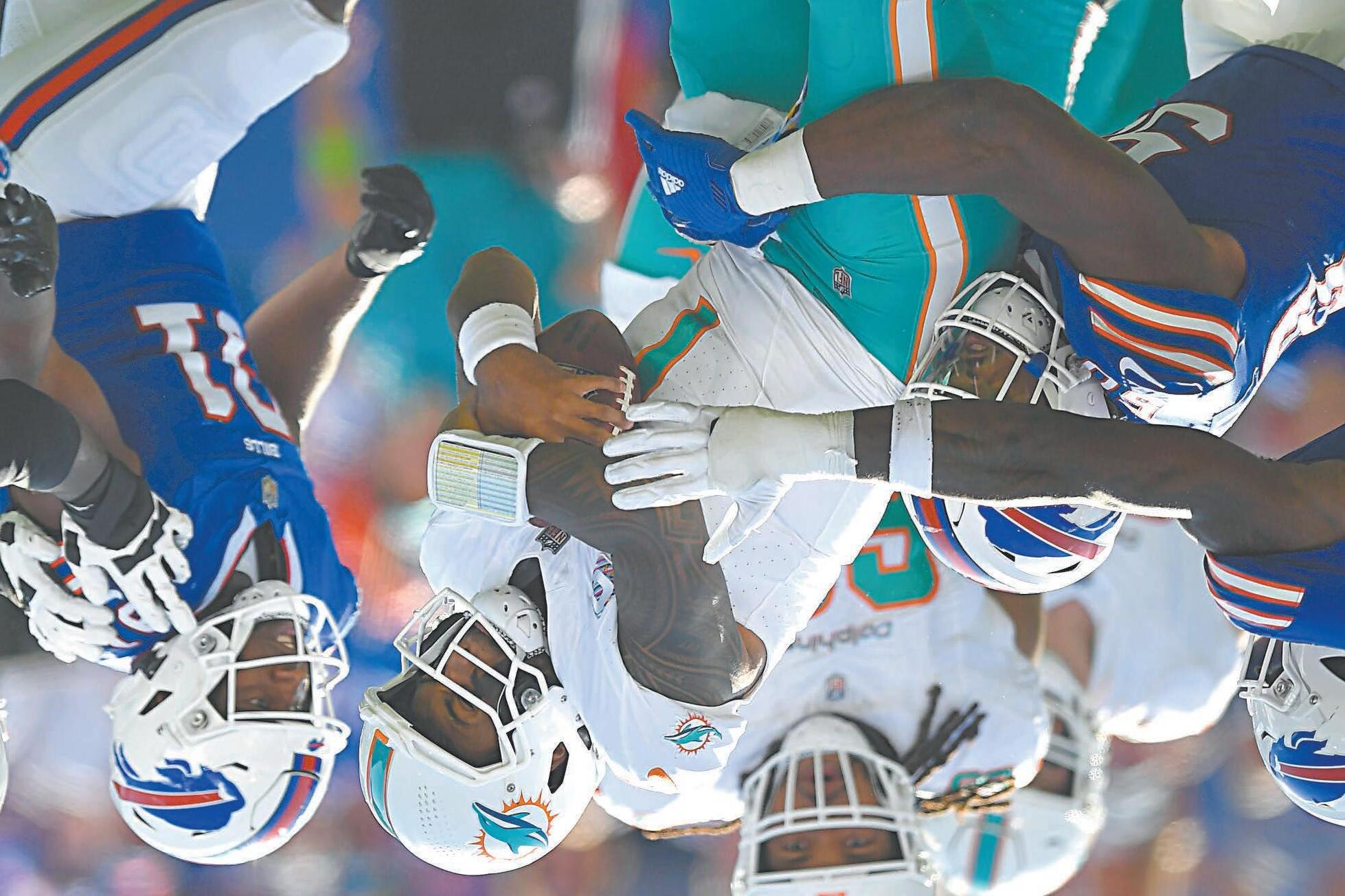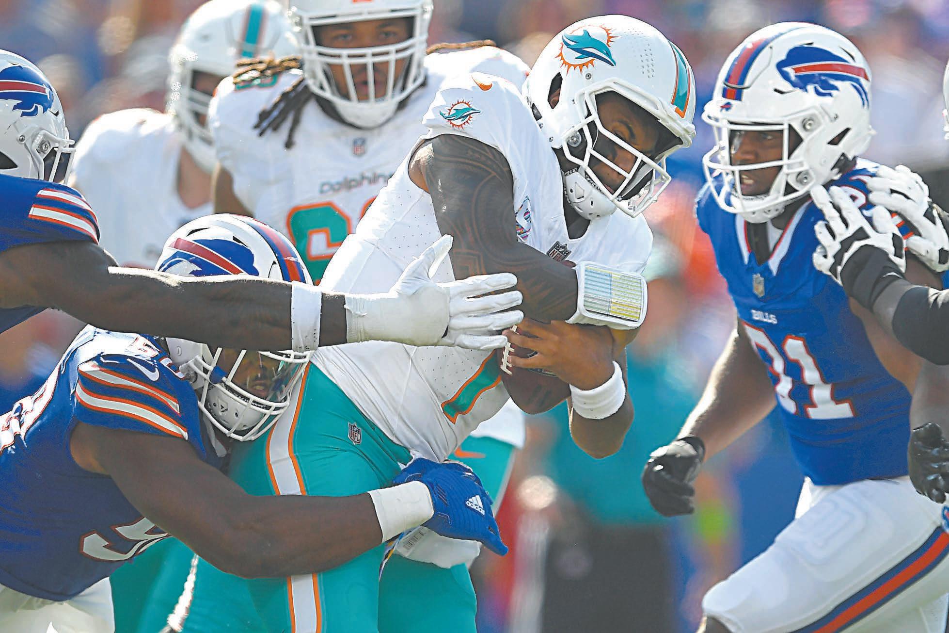 Micah Hyde consiguió una intercepción, y Ed Oliver, Greg Rousseau y DaQuon tuvieron capturas mientras los Delfines se iban de 3-0 en intentos de conversión de cuarto intento