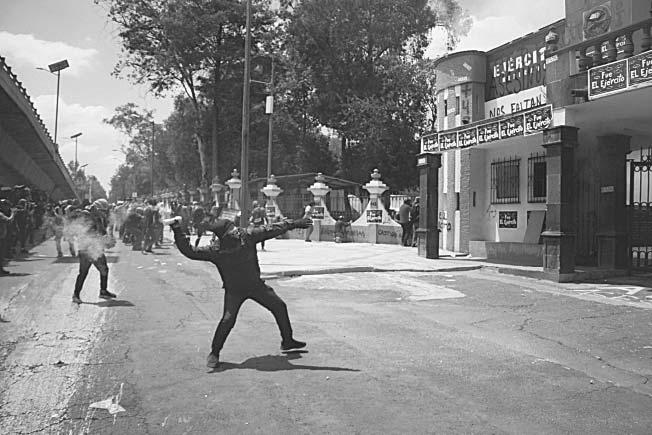 En la movilización, normalistas de la Escuela Rural “Raúl Isidro Burgos”, de Ayotzinapa, la mayoría encapuchados, arrojaron piedras, cohetones y petardos por espacio de 15 minutos a los integrantes de la Policía Militar y de la Secretaría de Seguridad Ciudadana de la Ciudad de México. También derribaron una puerta del campo militar y algunos barandales de las instalaciones.