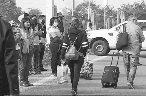 Por el cierre del acceso carretero, cientos de pasajeros han tenido que cargar con maletas para poder cruzar el bloqueo y llegar a la terminal aérea y no perder sus vuelos.