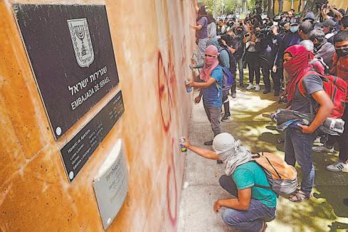 Al concluir los mensajes, jóvenes con el rostro cubierto efectuaron pintas en la fachada de la Embajada con las leyendas “Palestina Vive”, “Extradición a Tomás Zerón”, “Ni perdón ni olvido”, “43” y “Muerte al sionismo”; también tiraron las cámaras de seguridad del inmueble.