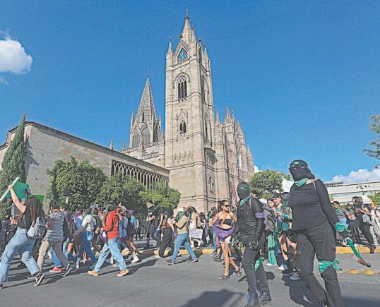 En Guadalajara, Jalisco, un contingente se reunió en las inmediaciones del templo expiatorio. Portaron pancartas para conmemorar el día. Las mujeres, en su mayoría encapuchadas, gritaron consignas y portaron pancartas para conmemorar.