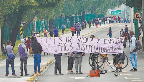 Poco después de las 14:20 horas los manifestantes -quienes previamente habían tomado la dirección de su facultad- se colocaron sobre dicha vialidad enarbolando una manta con la frase “CCH Sur viola y encubre. Exigimos justicia”.