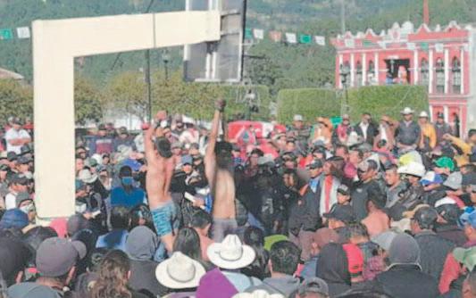 Indígenas tzeltales del municipio de Huixtán, detuvieron a cuatro hombres acusados de integrar una banda de asaltantes, quienes fueron atados de manos y colgados en el tablero de la cancha de básquetbol de la cabecera municipal de Huixtán, en Chiapas.