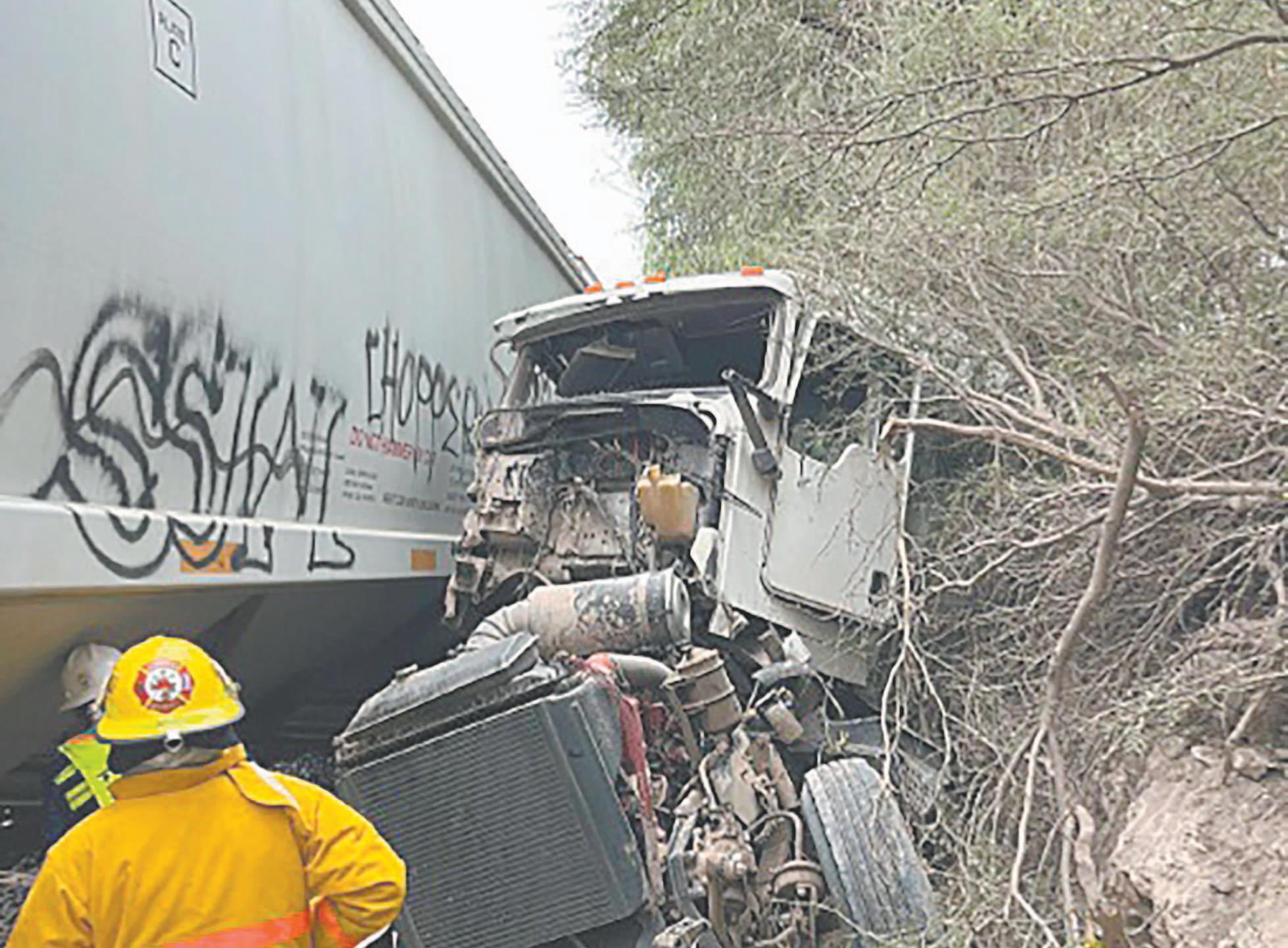 posible y golpeó el tráiler, lo que produjo el descarrilamiento de la locomotora volcando fuera de la vía. El operador del tren y el chofer del tráiler presentan heridas leves, por lo que fueron trasladados para su atención médica.