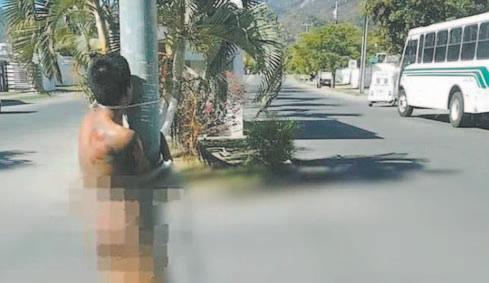 En las imágenes de un video, que se ha hecho viral en redes sociales, se logra ver al delincuente completamente desnudo y atado con cuerdas a un poste de luz sobre la calle.