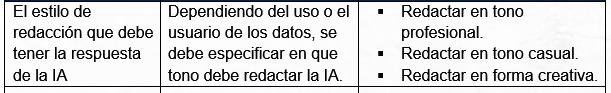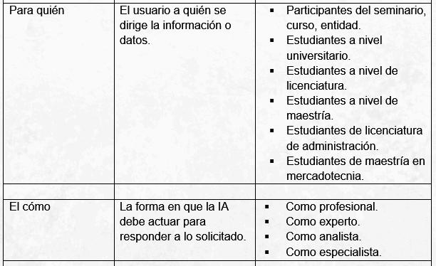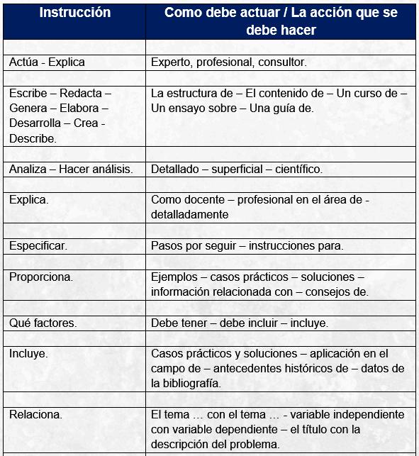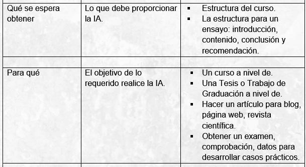Aspectos que deben ser considerados para elaborar un Prompt (instrucción, pregunta, requerimiento, invitación a proporcionar, generar, escribir o indicar algo)