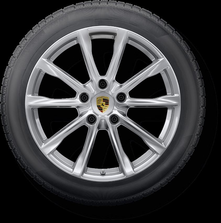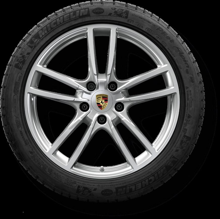 Leichtmetallräder in filigranem 5-Speichen-Design mit Doppelspeichen in Brillantsilber. Nicht in Verbindung mit Porsche Ceramic Composite Brake (PCCB).