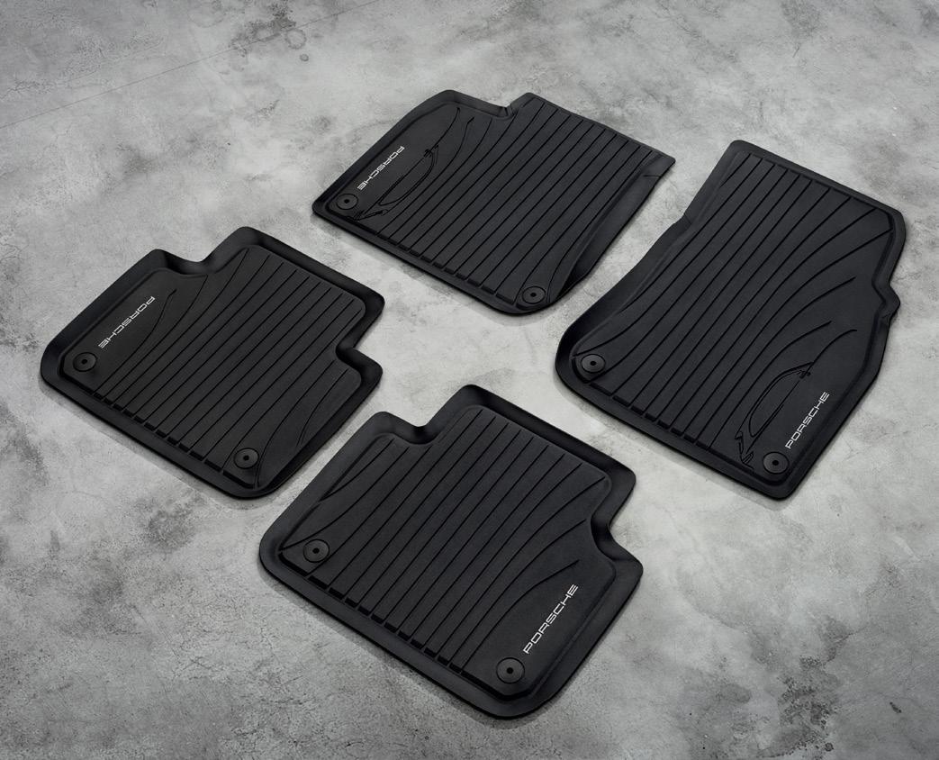 Vierteiliger Satz in ansprechendem Design mit Fahrzeugsilhouette und „PORSCHE“ Schriftzug. Verrutschsicher und wasserundurchlässig mit hochgezogenem, umlaufendem Rand.