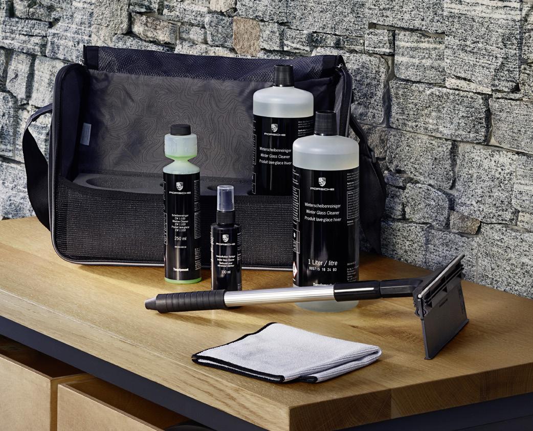 Pflegeserie in einer wasserfesten Tragetasche mit praktischen Innenfächern. Das Set umfasst Winter Scheibenreiniger-Konzentrat (2 Flaschen je 1 l), Scheibenreiniger (250-ml-Flasche), Innenscheibenreiniger (100-ml-Flasche), Eiskratzer und Mikrofaser-Reinigungstuch.