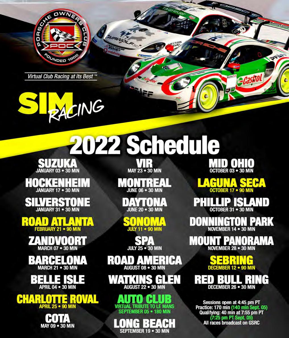 CLICK HERE for YouTube SIM RACES Results Virtual Club Racing at its Best TM Jul 25 SPA Aug 8 Road America Aug 22 Watkins Glen Sep 5 Auto Club Sep 19 Long Beach Oct 3 Mid Ohio Oct 31 Phillip Island No v 14 Donnington Pk No v 28 Mount Panorama Dec 12 Sebring Dec 26 Red Bull Ring (90 Minutess) Virtual Tribute to LeMans 180 Minutes All club members with track experience or online sim racing experience are invited to participate – however, you will need an iRacing Membership and a simulator.