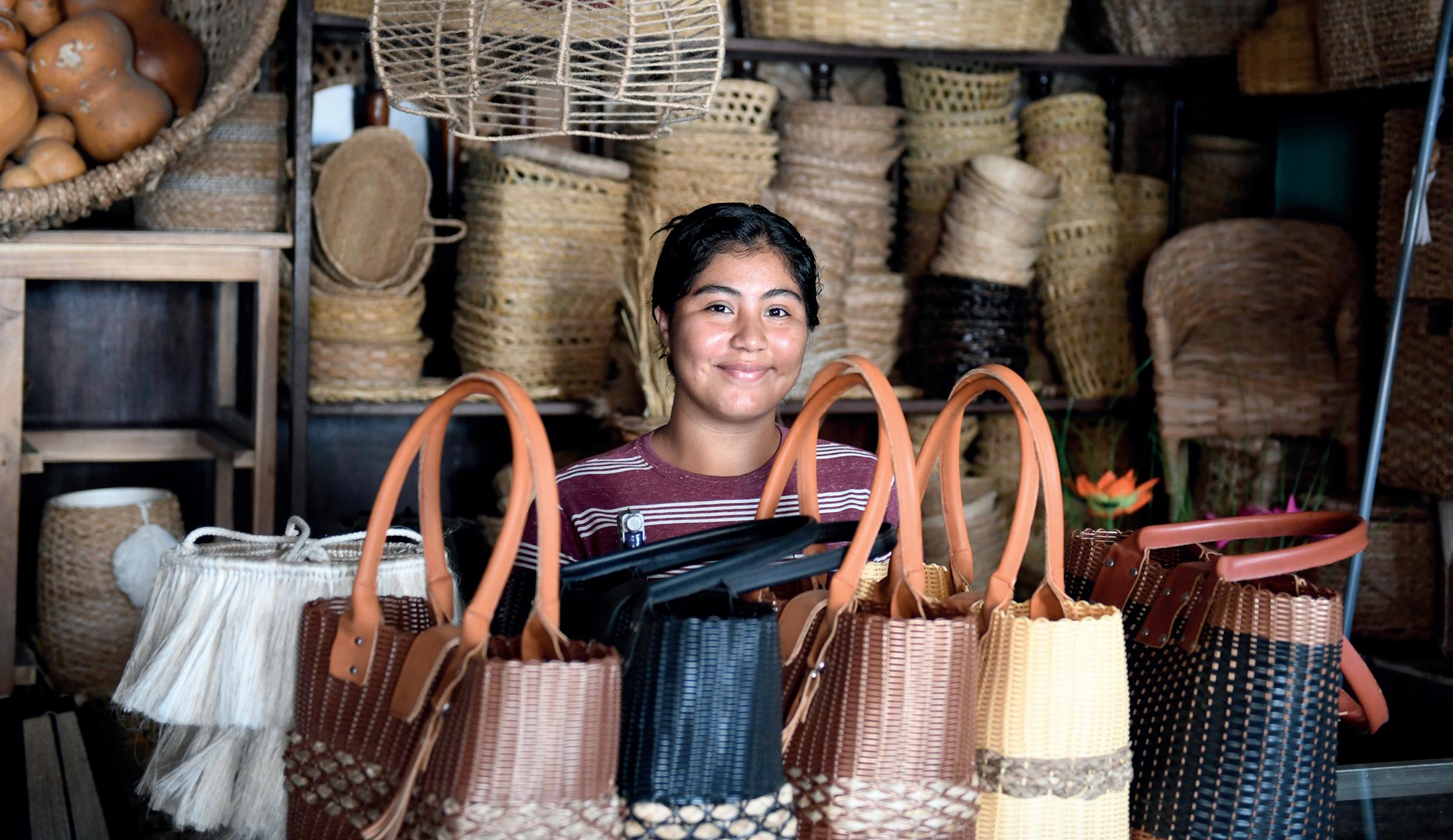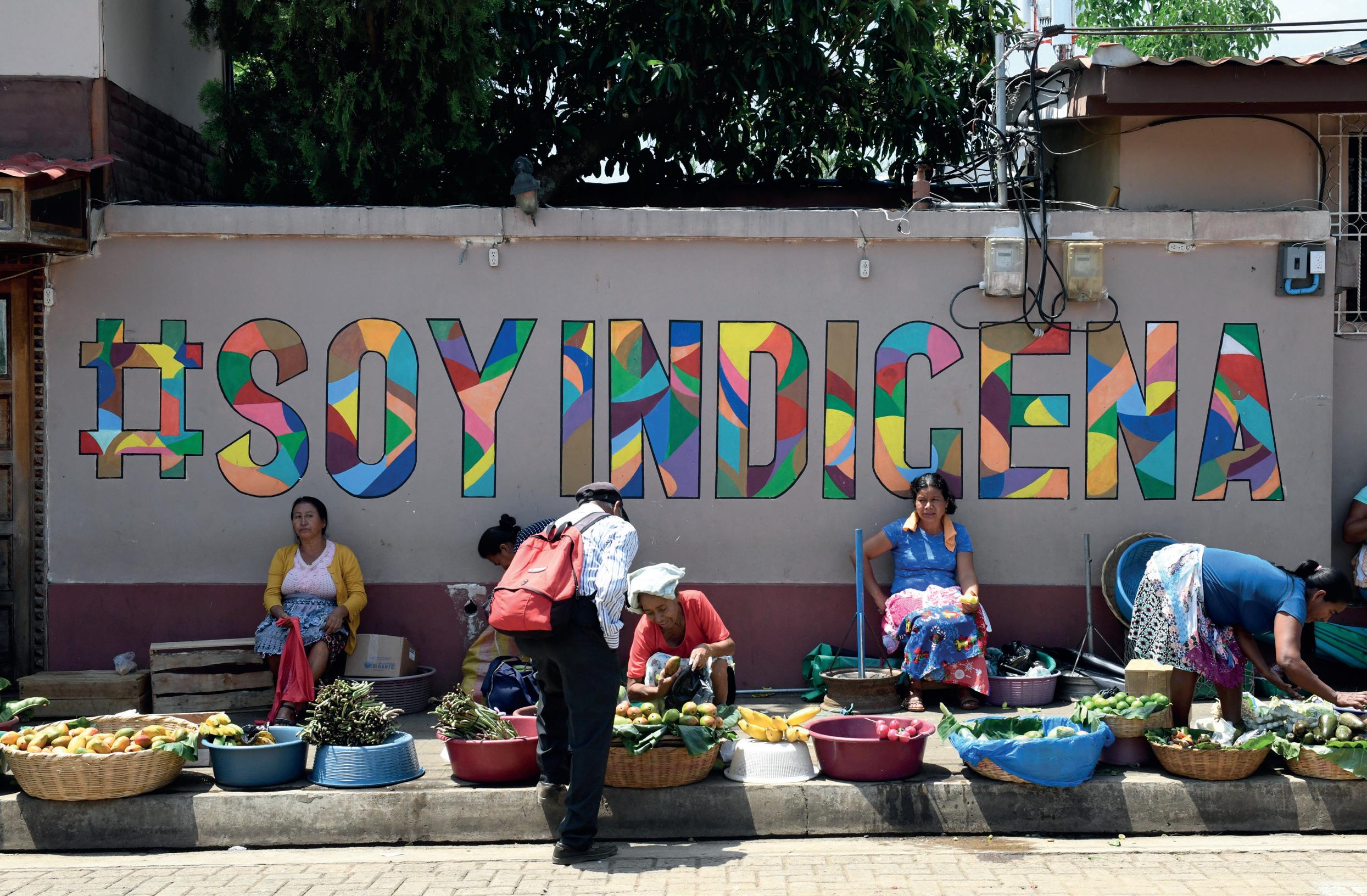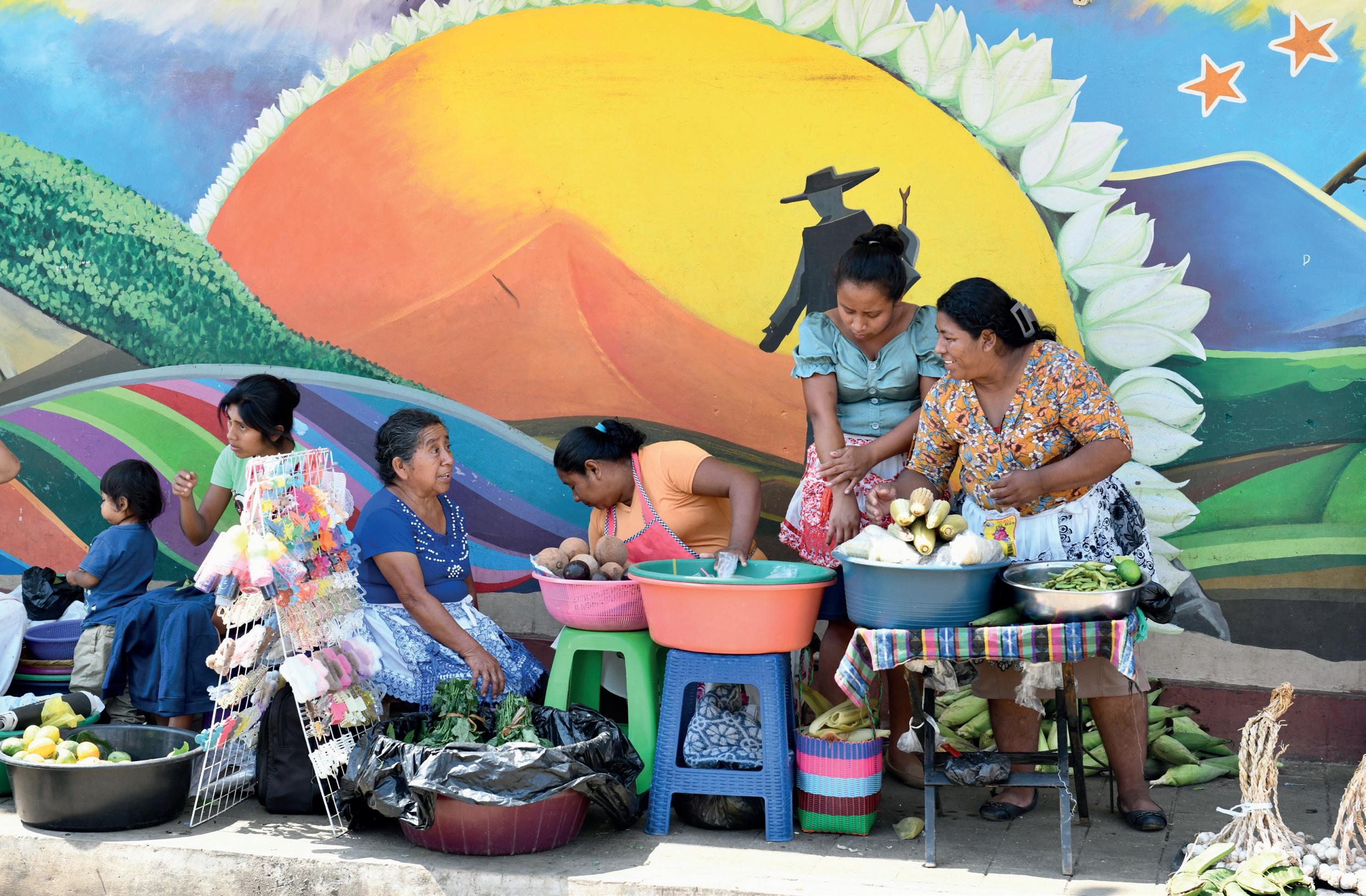 The village of Nahuizalco is one of the few places in El Salvador where people of Indigenous heritage, the Pipil, still walk around in traditional dress. At the daily market they gather beneath the mural reading “soy indígena” (I am Indigenous). They sell fruit, vegetables, and woven handicrafts created using centuries-old techniques.