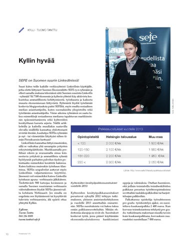Suuri kiitos teille kaikille verkkoyhteisö LinkedInin käyttäjille, jotka olette liittyneet Suomen Ekonomiliitto SEFE ry:n ryhmään ja olleet samalla mukana tekemässä siitä Suomen suurinta LinkedIn –ryhmää! Yli 7300 ekonomin ja kylterin yhteisö käy aktiivista keskustelua ammatillisesta kehittymisestä, työnhausta ja kaikesta muusta ekonomiuraan liittyvästä. Ryhmästä löydät työelämää koskevia blogipostauksia paitsi SEFEltä, myös muilta sosiaalisen median asiantuntijoilta, kuten suomalaisilta yliopistoilta sekä työelämän asiantuntijoilta. Viime aikoina ryhmässä on saatu lukea esimerkkejä sosiaalisessa mediassa tapahtuvan markkinoinnin epäonnistumisesta sekä kyltereiden kesätyöhaun karusta arjesta. Näillä artikkeleilla ja kaikella muullakin saatavilla Palkkasuositukset vuodelle 2013 olevalla sisällöllä kannattaa ehdottomasti sivistää itseään, kuuluitpa SEFEn ryhmään jo nyt - tai viimeistään liityttyäsi siihen täOpintopisteitä Helsingin talousalue Muu maa män Pörssikurssin luettuasi! LinkedIniin kannattaa liittyä muutenkin, < 120 2 000 €/kk 1 800 €/kk sillä se vaikuttaa yhä useampiin yritysten rekrytointipäätöksiin. Muokkaamalla pro120-180 2 100 €/kk 1 850 €/kk fiiliasi oikein ja seuraamalla sinua kiin181-220 2 200 €/kk 1 950 €/kk nostavia yrityksiä ja ammatillisia ryhmiä hyödynnät parhaiten palvelun täyden po220 < 2 300 €/kk 2 050 €/kk tentiaalin esimerkiksi kesätöitä hakiessa. Kuten kaikissa muissakin työnhaun tilanteissa, SEFEn urapalvelut auttavat myös Lähde: http://www.sefe.fi/kesatyopalkkasuositukset LinkedInin valjastamisessa käyttöösi. Jäsenenä voit esimerkiksi katsoa LinkedIn työnhaun apuna –webinaarin jälkikäteen. Tiedettävästi 900 katsojaa keränneen ja oppeja ja valmiuksia. Otathan huomioon, Kyltereiden kesätyöpalkkasuositukset vuodelle 2013 samalla Suomen suurimman webinaarin että joillain toimialoilla toimihenkilöiden videotallenteen löydät SEFEn jäsensivuilpalkkaus perustuu työehtosopimuksissa ta kohdasta Webinaarit. Jos sinulla on Kyltereiden kesätyöpalkkasuositukset sovittuihin taulukkopalkkoihin tai harjoitongelmia sen löytämisessä tai kysyttävää perustuvat syksyllä 2012 tehtyyn tutkiteluajan palkkoihin. tulevista webinaareista, älä epäröi ottaa mukseen, yleiseen ansiotasokehitykseen Palkattaessa opiskelija työsuhteeseen yhteyttä Kylliin. ja vuodelle 2013 annettuihin ennusteipro gradu -työskentelyn ajaksi, on suosisiin. SEFEn suosituksista voi hakea tukea teltava kuukausipalkka 2 400 euroa. Kun Kyllinne, omiin palkkaneuvotteluihin. Mitään ehkorvaus toimeksiantona tehdystä pro graTuomo Tanttu dottomia alarajoja ne eivät ole. Suositukset du -tutkielmasta maksetaan muulla tavoin 044 286 8805 koskevat työtä, jossa pääset käyttämään kuin kuukausipalkkana, korvauksen suutuomo.tanttu@sefe.fi ekonomikoulutuksessa hankkimiasi ruudeksi suositellaan 7 000 euroa.