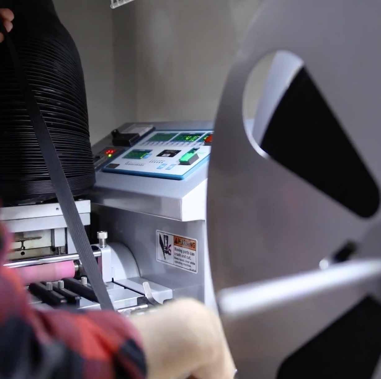 While the table is cutting the fabric, our automated webbing cutter is working on straps. The cutting machine cuts each piece of webbing with a heated blade down to the smallest tolerance of error. From there, buckles and any YKK zippers that are needed are collected with the straps and fabric to head up to the sewing team.