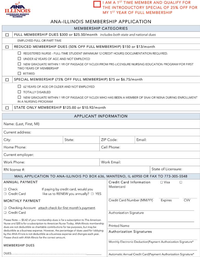 Acceptance of advertising does not imply endorsement or approval by the ANA-Illinois and Illinois Nurses Foundation of products advertised, the advertisers, or the claims made. Rejection of an advertisement does not imply a product offered for advertising is without merit, or that the manufacturer lacks integrity, or that this association disapproves of the product or its use. ANA-Illinois and the Arthur L. Davis Publishing Agency, Inc. shall not be held liable for any consequences resulting from purchase or use of an advertiser’s product. Articles appearing in this publication express the opinions of the authors; they do not necessarily reflect views of the staff, board, or membership of ANA-Illinois or those of the national or local associations.