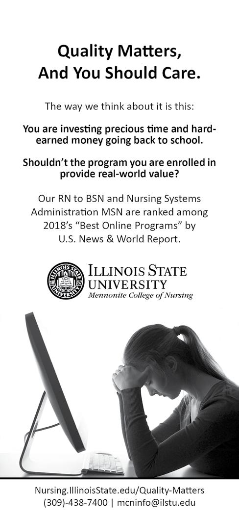 It is also essential that we recognize nurses of all types, LPNs, RNs and APRNs, who are doing outstanding work to advance the profession in Illinois (IL). Nominations for the annual IL Nurses Foundation (INF) 40 under 40 Emerging Nurse Leader Award are now underway, with online submissions closing on April 15, 2018. I encourage you to nominate a colleague who demonstrates exemplary professional practice and also makes an impact in the community or professional organizations. Visit www. illinoisnurses.foundation to learn more or nominate a nurse.