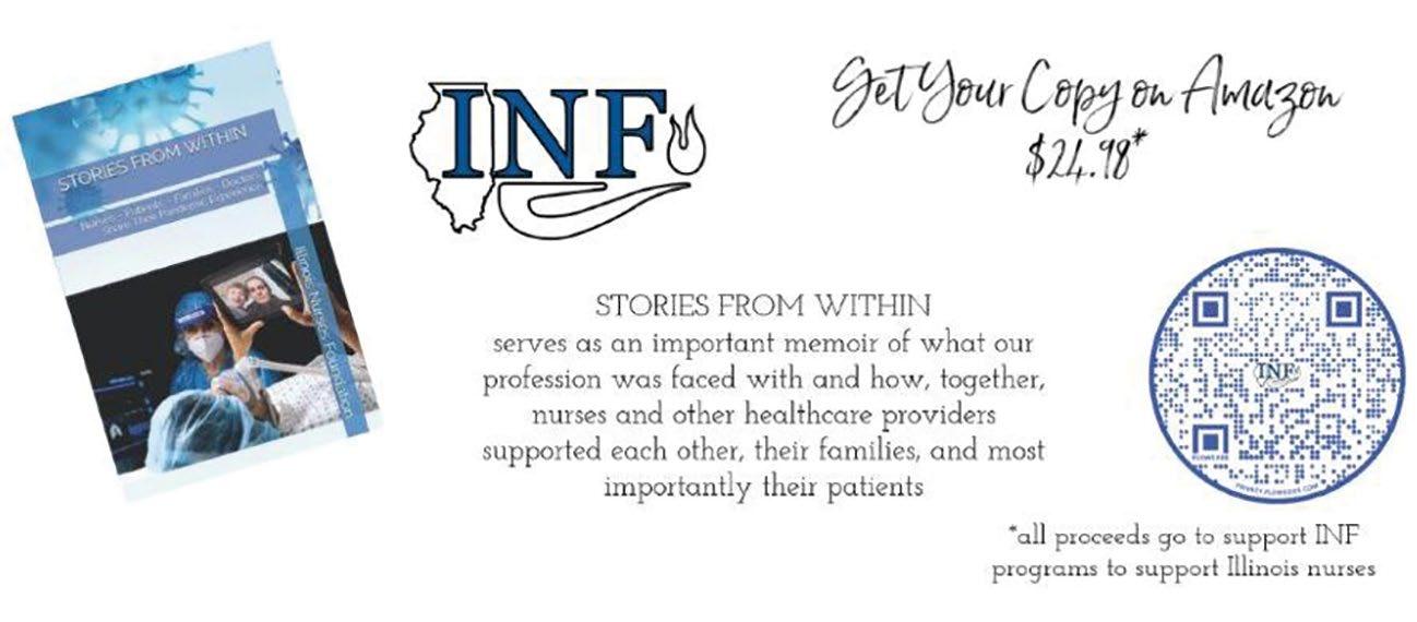 The IL Nurses Foundation (INF) has continued it’s work of collaborating with community partners in promoting the health of the public by supporting nurses through charitable research and educational initiatives. The INF is strategically looking at ways to increase the numbers and amounts of monies awarded to student scholarships and nurse grants. We have been very successful in adding to our bottom line through the publication of the book, Stories From Within: Nurses, Patients, Families, Doctors Share There Pandemic Experience. The book is available in hardcopy and e-version through Amazon.com. All profits from the purchase of the book go to the INF. If you are interested in reading real life stories of living through the pandemic, this is the book for you. It would also make a great Holiday gift or Graduation gift for that special person in your life. It is moving and tells it like it is.