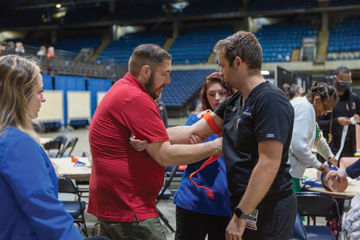 the formal presentations. Over 100 students participated in the hands on workshop. The number one cause of preventable death after an injury is bleeding. A bleeding injury can happen anywhere. Life-threatening bleeding can happen in people injured in serious accidents or disasters. The training helped to prepare the participants to become an immediate responder to STOP THE BLEED.