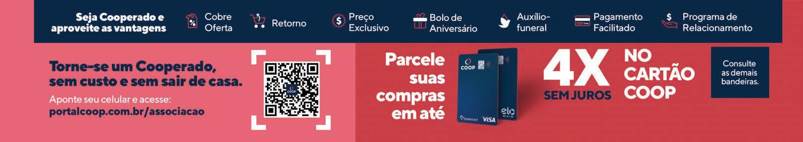 Condição válida somente para compras realizadas nos Supermercados e Drogarias Coop, com pagamento efetuado com o Cartão Coop. Bandeiras válidas: Elo, Mastercard, Private Label e Visa. Parcela mínima de R$ 5,00. O arredondamento, se houver, será na última parcela. Sujeito a aprovação de crédito e a cobrança de anuidade. Consulte as condições gerais com os nossos colaboradores. Em caso de dúvida, ligue: 4004-7332, para capitais, ou 0800 7017992, para demais localidades.