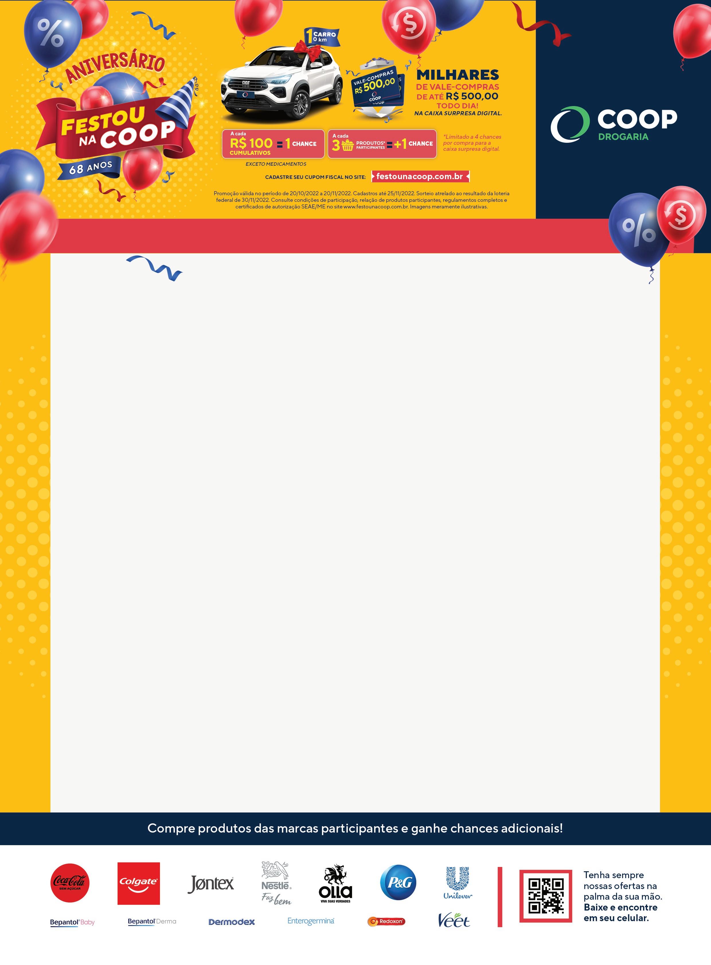 40 38, 90Buscofem 400mg com 20 cápsulas 23, 34 compre 1 unidade por % DESCONTO NA 2ª UNIDADE Nesta promoção a 2ª unidade sai por: 12, 89 8, 99 R 26, 97 Toalhas umedecidas Protecthealth com 120 unidades tipos compre 1 unidade por: LEVE Nesta promoção a unidade sai por: POR 3 cada Dorflex com 36 comprimidos 16, 79 cada 20, 89 de por cada Sal de Fruta Eno com 2 envelopes Sabores 3 2 , 17 2, 89 4 cada LEVE PAGUE Nesta promoção a unidade sai por R$ R$ Bepantol Derma Seco creme 30 29, 90 ca L Óréal solar Expertise FPS 60 Antirrugas 50g 36, 90 cada 42, 90 de por cada Kit Composto Lácteo Milnutri Premium Danone Fase Pré Escolar com 2 unidades de 800g cada 72, 90 cada Complemento Alimentar Nutren Senior 740g Sabores 99, 90 cada Ofertas válidas entre os dias 20/10 e 20/11/2022, enquanto durarem os estoques 12 13, 33 159, 90 Aparelho de pressão Omron HEM 6124 Pulso NO CARTÃO COOP cada parcela XSEM JUROSOU à vista por