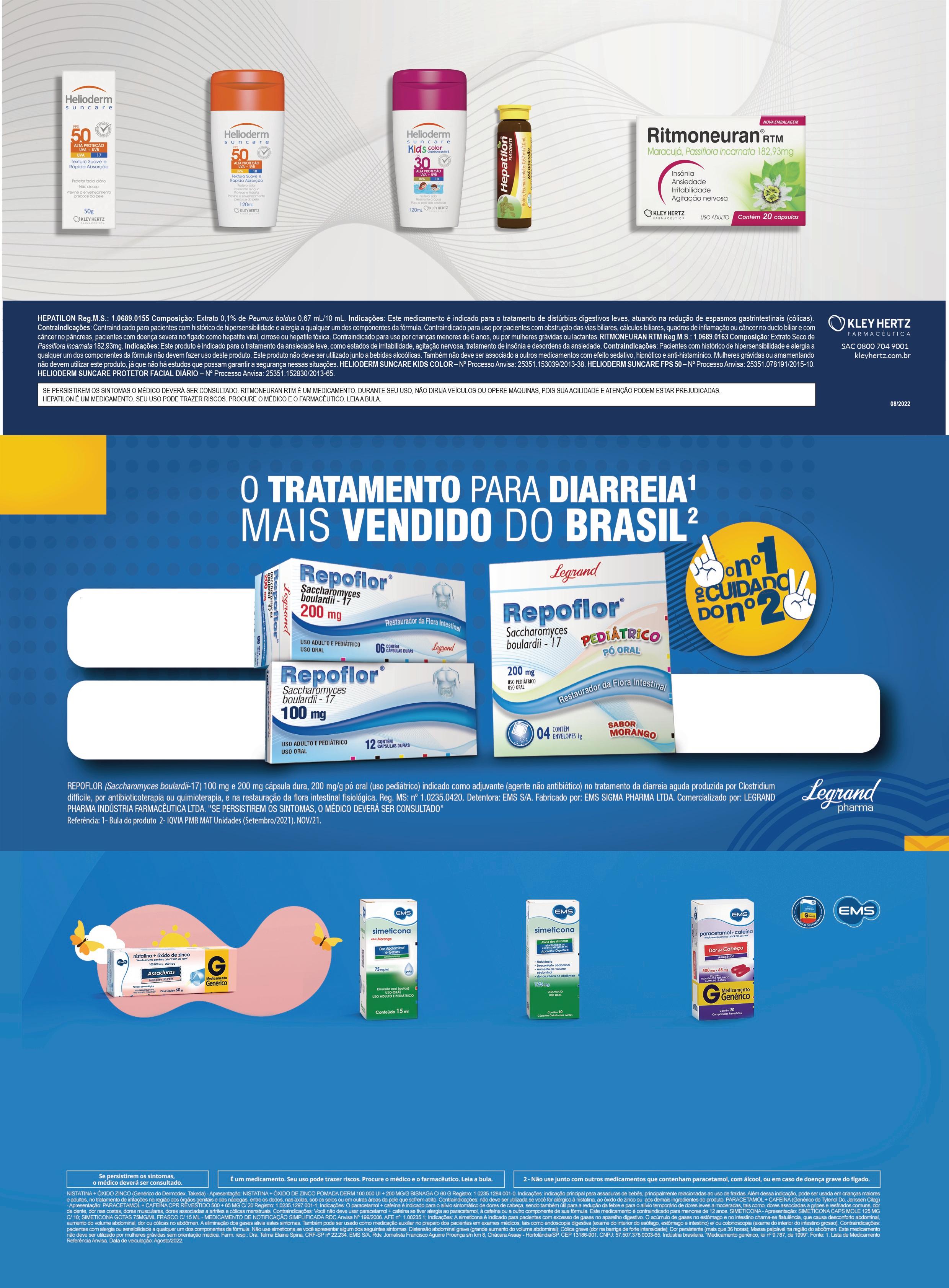 Kit Protetor solar Corpo FPS 50200ml e Facial FPS 50 Helioderm Suncare 35, 89 cadaR$ Protetor solar Helioderm Rosto FPS 50 50g 33, 90 Rcada $ Protetor solar Helioderm Suncare FPS 30 Kids 120g 29, 90 cadaR$ Hepatilon Flaconete 10ml 2 1 , 50 2 , 25 3 cada LEVE PAGUE Nesta promoção a unidade sai por R$ R$ Repoflor 100mg com 12 cápsulas ² 29, 90 Rcada $ Repoflor 200g com 4 sachês 23, 20 Rcada $ Repoflor 200mg com 6 cápsulas 6 27, 90 Rcada $ Ritmoneuran RTM com 20 comprimidos 19, 90 Rcada $ Nistatina + Óxido de Zinco pomada EMS 60g 2 14 , 83 22 , 25 3 cada LEVE PAGUE Nesta promoção a unidade sai por Simeticona 75mg gotas EMS 15ml 2 6 , 93 10 , 39 3 cada LEVE PAGUE Nesta promoção a unidade sai por Paracetamol + Cafeína EMS com 20 comprimidos 2 10 , 93 16 , 40 3 cada LEVEPAGUE Nesta promoção a unidade sai por R$ R$ Simeticona 125mg EMS com 10 cápsulas 2 6 , 86 10 , 29 3 cada LEVE PAGUE Nesta promoção a unidade sai por