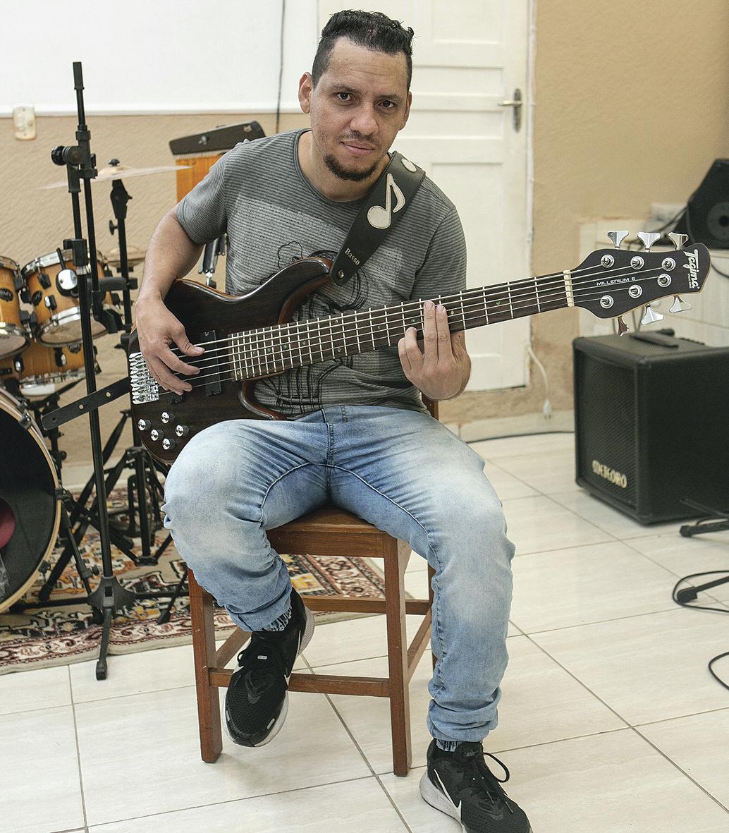 “Gostei logo de cara, aprendi com facilidade e me juntei ao grupo da congregação até retornar ao Grande ABC” conta Também não demorou para garantir seu primeiro contrabaixo “ Troquei minha bici cleta por um baixo Jennifer 4 cor das”, recorda Hoje, se apresenta com um Tagima 6 cordas
