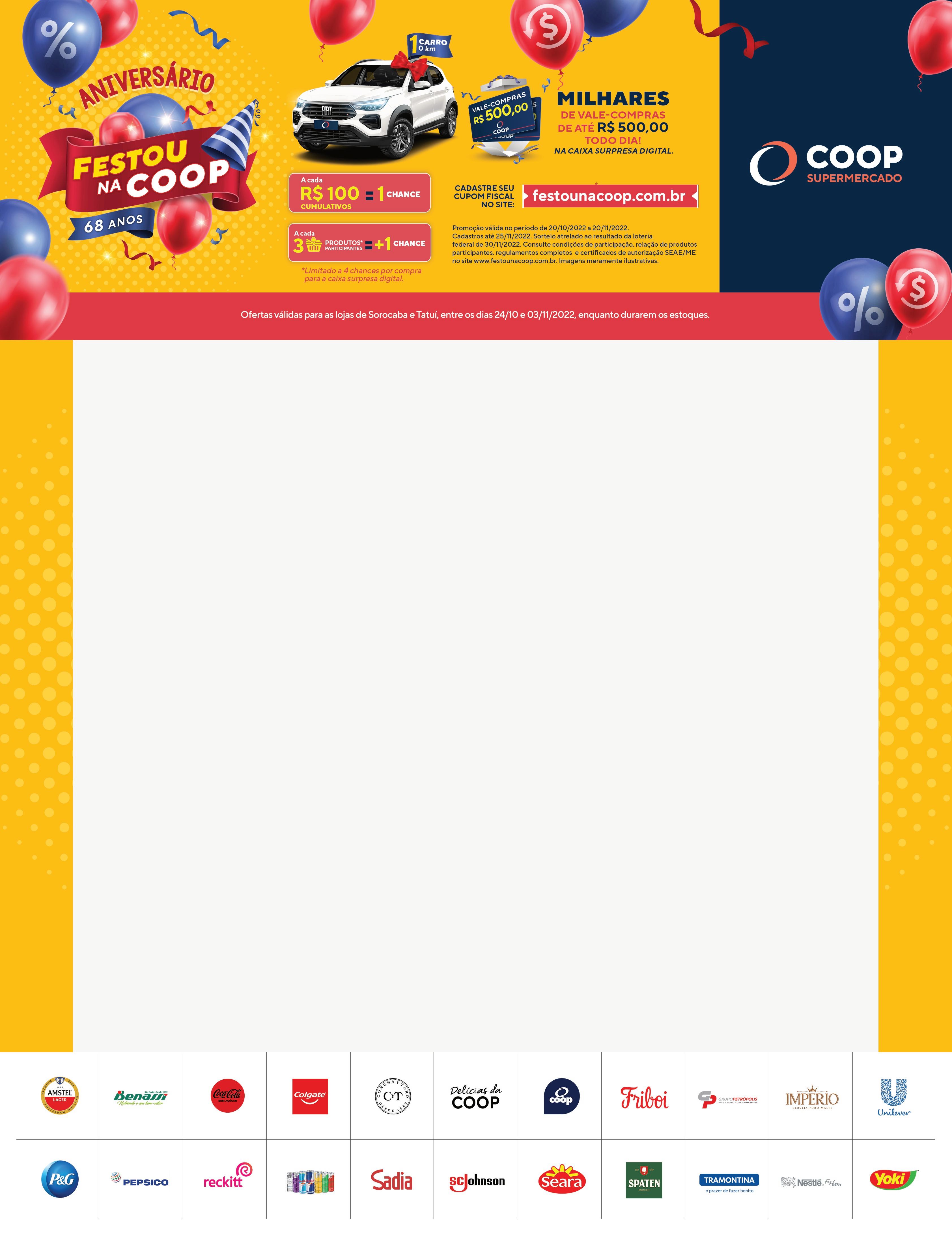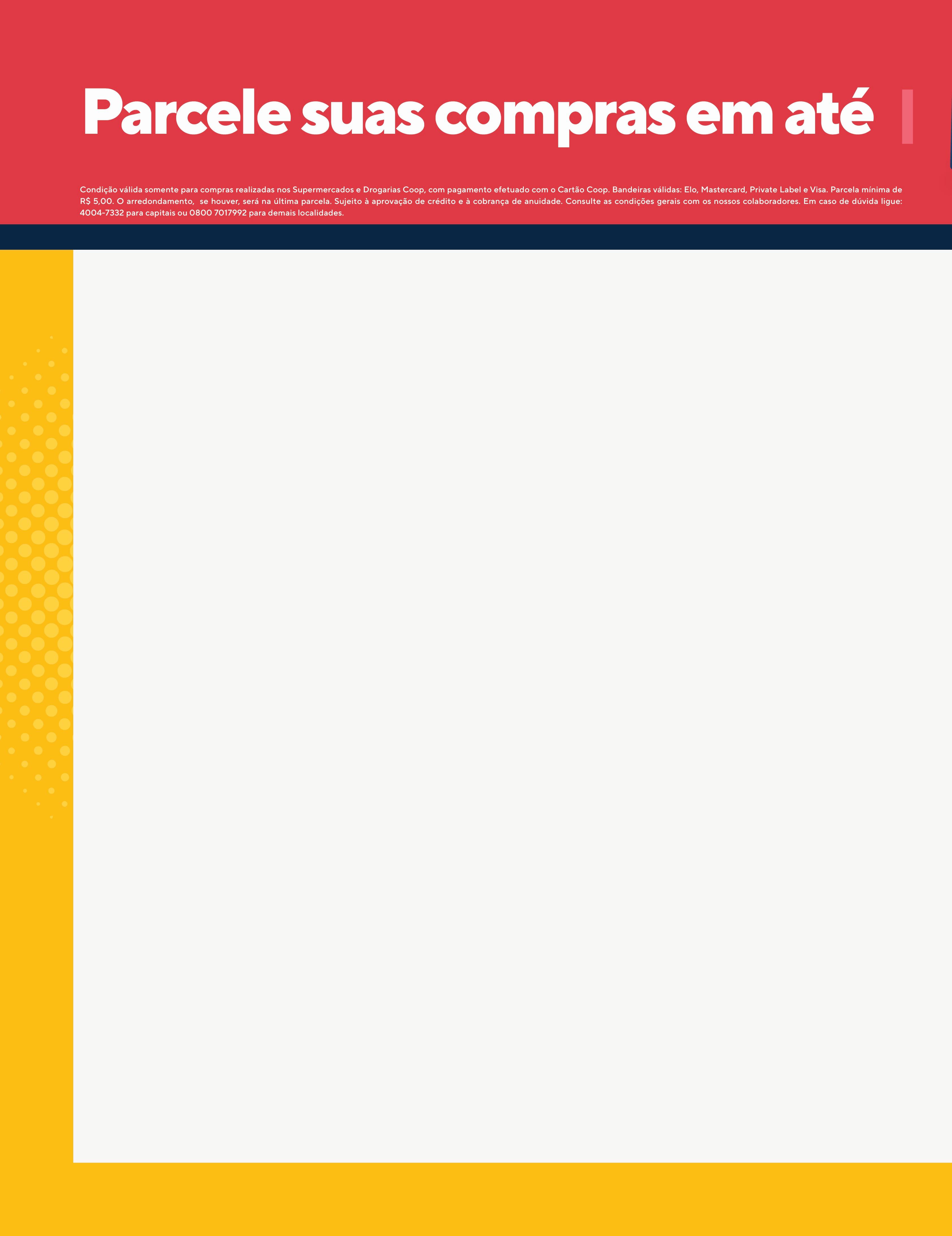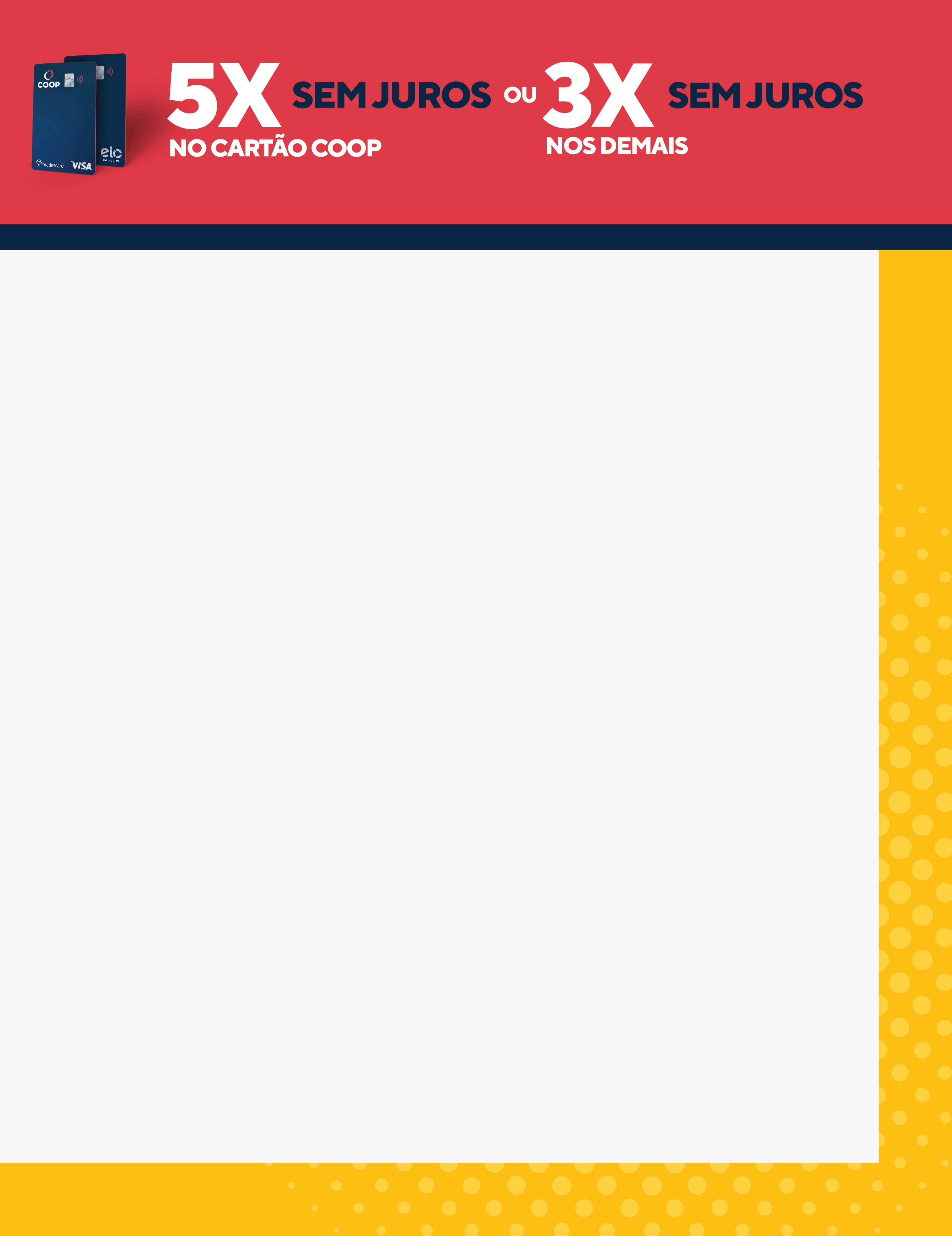 Arroz tipo 1 Guacira 5kg 17, 99 cada 1899 de por cada Água sanitária Coop 2 litros 3, 99 cada 4, 69 de por cada Desodorante aerossol Rexona 150ml Fragrâncias 9, 99 cada 13, 29 de por cada Filé de costela Maturatta ( Entrecote ) Friboi kg 39, 89 6190 de por 12 39, 16 469, 90 Fritadeira Mondial AFN 40 549, 90 NO CARTÃO COOP cada parcela XSEM JUROSOU à vista p de 50 13, 79 Lasanha à bolonhesa Seara sabores 600g 6, 90 compre 1 unidade por % DESCONTO NA 2ª UNIDADE Nesta promoção a 2ª unidade sai por: Guaraná Antarctica pack com 2 unidades de 1 litro Preço exclusivo para Cooperados cada cada5, 39 5, 99 2, 39Presunto Seara a cada 100g de R$ 319 por hileno ado Concha garrafa tipos 29, 89 cada 9, 99 cada Lava roupas Tixan Ypê 1,6kg 17, 99 cada Enxaguante bucal Colgate Plax leve 500ml, pague 350ml 15, 99 cada 18, 49 de por cada Chocolate Bis 100,8g, ou 126g tipos 4, 89 cada 559 de por cada Café 3 Corações 500g embalagem almofada ou a vácuo 15, 99 cada 1899 de por cada Picanha bovina Maturatta Friboi peça a vácuo kg 59, 90 109, 90 de por Achocolatado em pó Toddy original 1 8kg 26, 99 cada 3299 de por cada