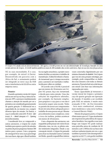 voam conectadas digitalmente por um sistema chamado de datalink. Um Gripen que voa em uma posição estratégia, por exemplo, pode compartilhar os dados dos seus sensores com todas as demais aeronaves. É possível até um avião lançar um míssil com base nas informações repassadas por outro. Essas capacidades já tornaram a versão inicial do Gripen o primeiro caça de quarta geração em operação do mundo. O modelo a ser recebido pela FAB, no entanto, é muito mais avançado. O NG - de New Generation - leva mais combustível, sistemas mais modernos e uma nova turbina, a General Electric F414G. Mesmo de pequeno porte, o Gripen é bem maior que os F-5 que atualmente são responsáveis pela defesa do espaço aéreo brasileiro. Isso significa voar mais longe: um Gripen NG pode realizar uma patrulha aérea de combate de 30 minutos a até 1.300 km da sua base sem realizar reabastecimento em voo, o que também é possível. Este desempenho é superior ao do F-5, com ganho também Aerovisão Jan/Fev/Mar/2014