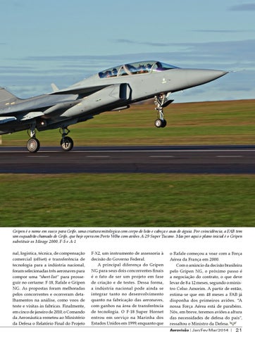 o Rafale começou a voar com a Força Aérea da França em 2000. Com o anúncio da decisão brasileira pelo Gripen NG, o próximo passo é a negociação do contrato, o que deve levar de 8 a 12 meses, segundo o ministro Celso Amorim. A partir de então, estima-se que em 48 meses a FAB já disponha dos primeiros aviões. “A nossa Força Aérea está de parabéns. Nós, em breve, teremos aviões a altura das necessidades de defesa do país”, ressaltou o Ministro da Defesa. Aerovisão Jan/Fev/Mar/2014