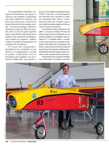 pouso e a decolagem automáticos para VANTs. Com isso, o veículo dispensa um operador para controlar as ações nos momentos mais críticos. A automação permite, por exemplo, operar em condições meteorológicas adversas, como no caso de nevoeiros. Os primeiros testes começaram em 2007 e o Acauã já realizou 90 voos de ensaio. Agora, há um aviãozinho na cor amarela pintado na fuselagem do protótipo nº 3. O símbolo indica o sucesso na execução do pouso automático totalmente controlado pelo computador de bordo, o que incluiu as fases de rampa de aproximação de precisão, alinhamento e nivelamento antes do toque na pista, corrida no solo e parada total da aeronave. A importância da conquista também está relacionada à tendência mundial